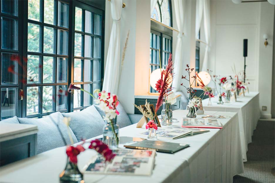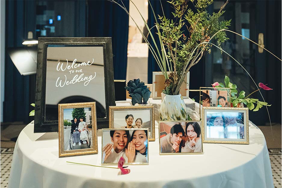 会場の半分を贅沢に使い、ふたりの幼いときの思い出が詰まったアルバムを展示しました。まるでギャラリーのように装花やキャンドルに彩られたアルバムコーナーでは、思わず「この時、こんなことあったね!」と懐かしい思い出話に花が咲きます。