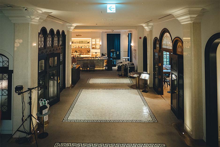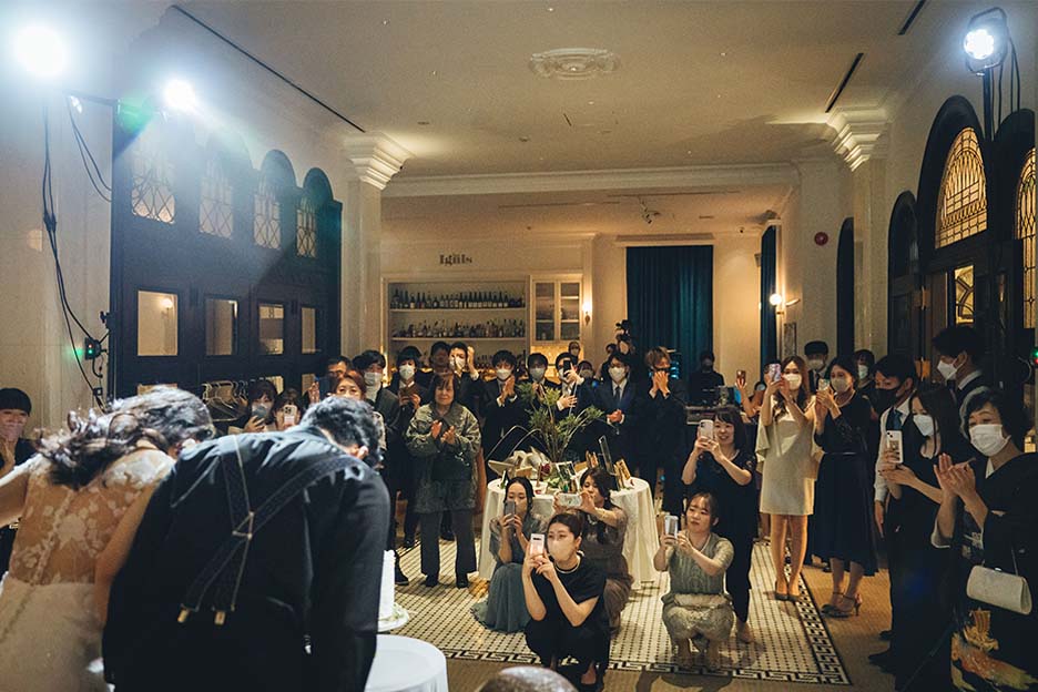 二部のパーティーでは、ドラマチックなナイトウエディングに合わせ、お色直しを行いました。装いを新たにした一磨さんとあゆみさんが登場したのは、レストランの中ではなく、なんとホテルのロビー。