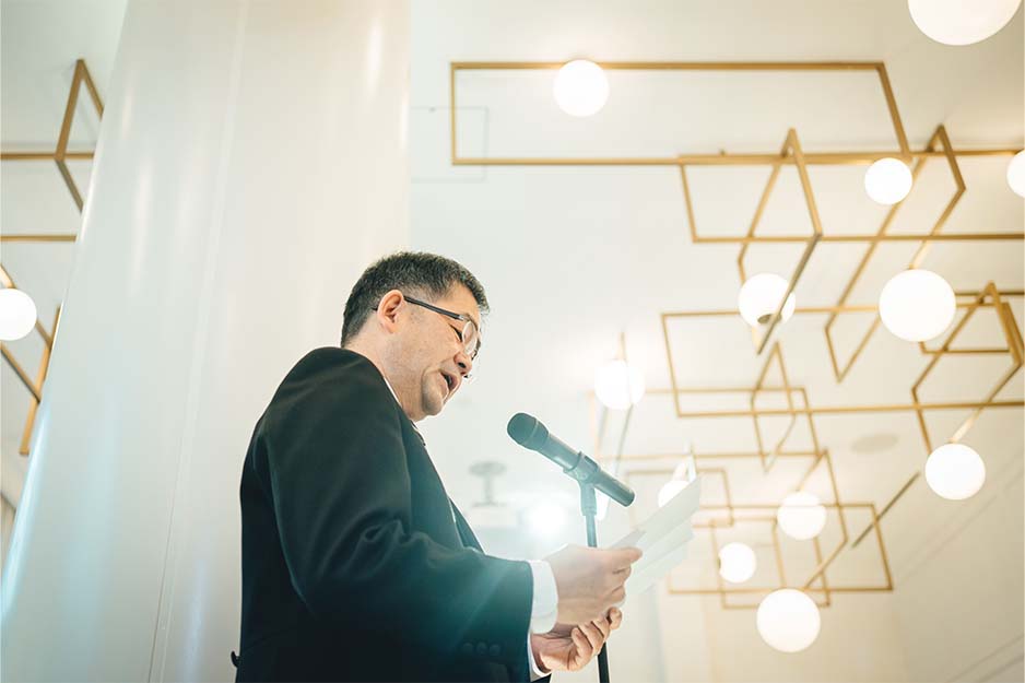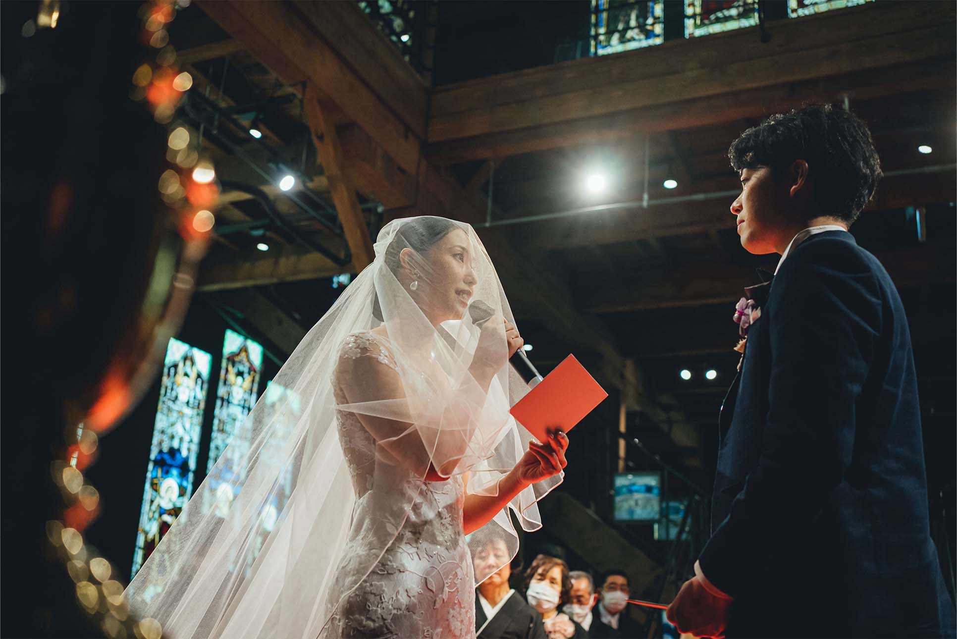 吹き抜けに展示されたシンボリックなステンドグラスの前で、一磨さんとあゆみさんは、お互いへの手紙を読み上げました。その言葉と声には微塵の照れや背伸びはなく、まっすぐに、ただまっすぐに想いが込められていました。