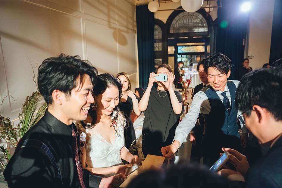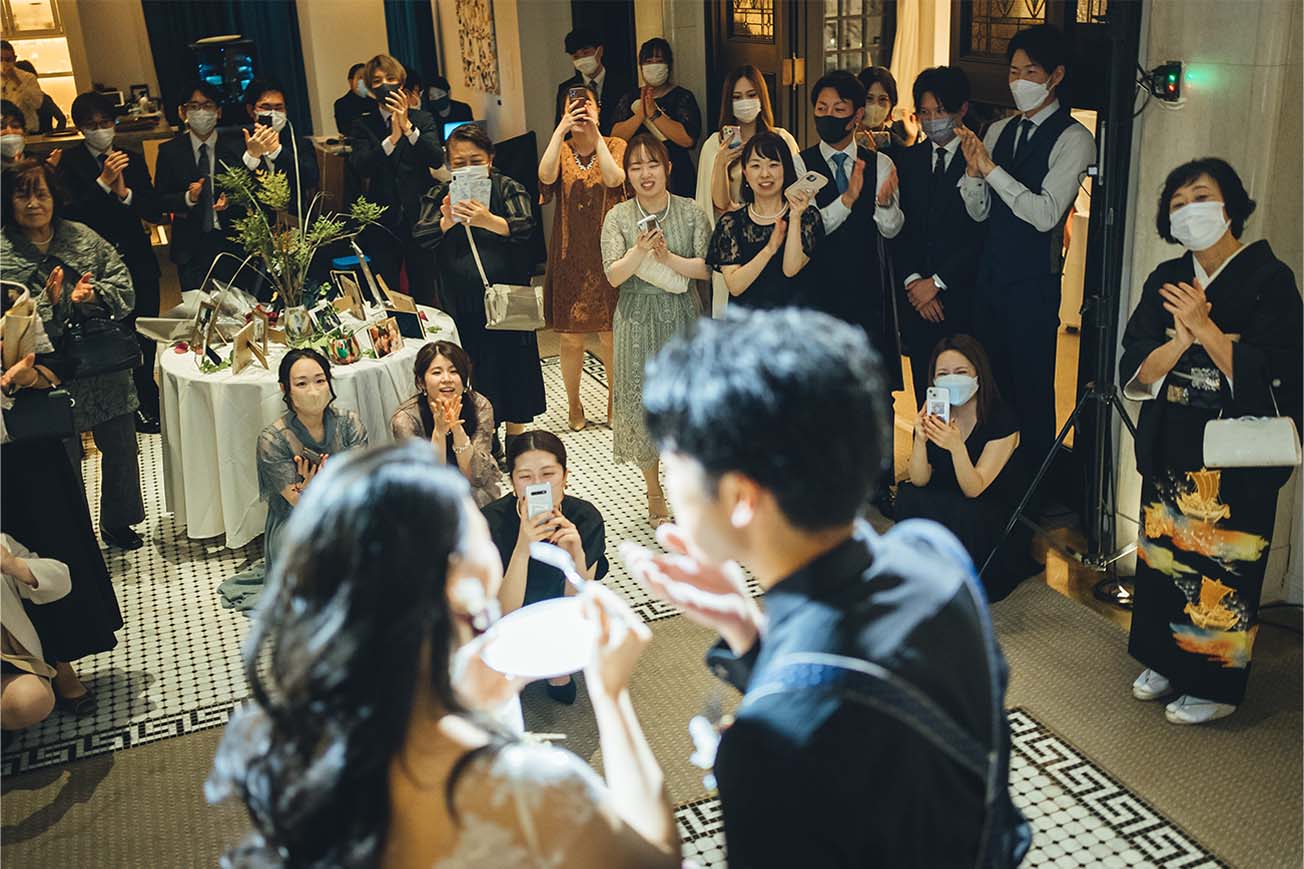 そのままロビーで過ごす時間はケーキカットやフォトタイム。「こんなに新郎新婦と距離の近い結婚式、初めてだった!」と何人ものゲストからご感想をいただいたそうです。
